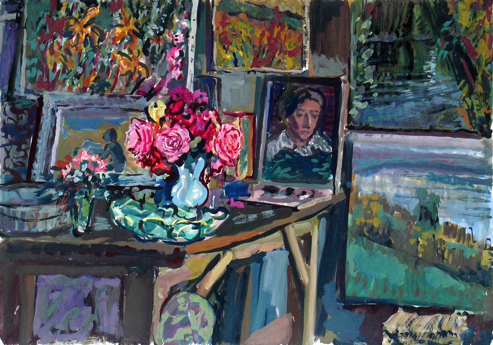 Strauss im Atelier mit Bildern, Tempera auf Papier, um 1988, 60 x 98 cm.